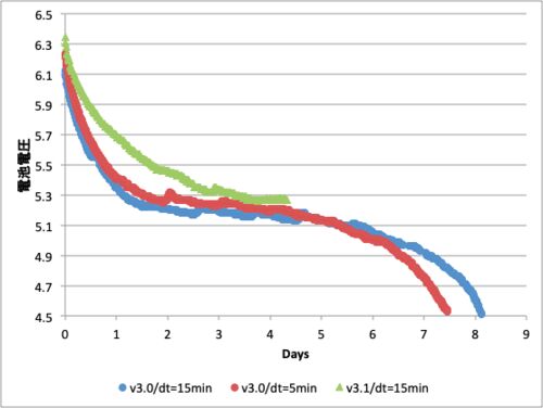LED(R)を外し、OLEDの表示文字を減らしたv3.1を動かし始めて4日目になります。電圧の変動を見てみます↓。 201022おお!、たしかに電圧の低下は遅くなっています。ただ、計算上は1ヶ月動く予定なのですが、ちょっと不安です。